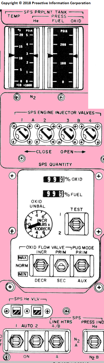 PRESS indicators show pressure in the helium (He), fuel(FUEL), and oxidizer (OXID) tanks. The helium tank pressure indicators also can be used to show pressure in the nitrogen storage tank of either of the redundant engine pneumatic valve control system, depending on the position of the PRESS1 NO switch at the bottom of the panel.