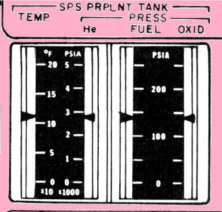Shows temperature and Pressure of service propulsion subsystem tanks.
